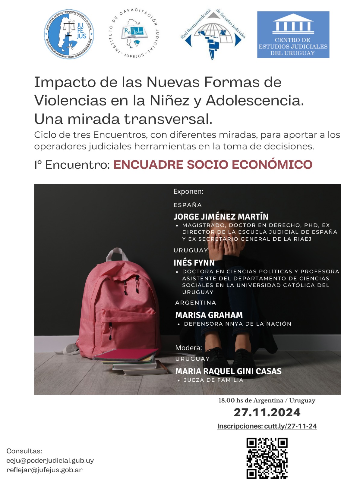Por informes pueden ingresar en la dirección www.reflejar.gob.ar o dirigirse a los correos electrónicos: reflejar@jufejus.org.ar y ceju@poderjudicial.gub.uy
